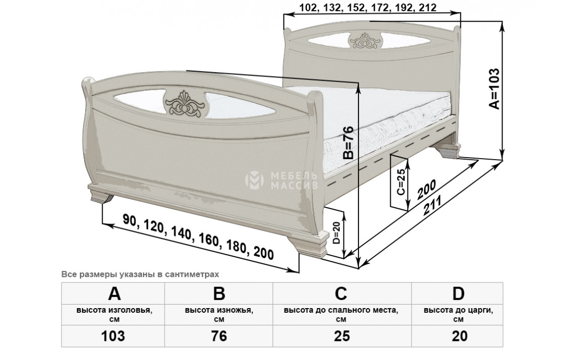 Кровать Эльза имеет две идентичные спинки, отличающиеся аккуратной изогнутостью, декоративными углублениями и цветочными узорами. Изделие, которое можно купить по специальной цене в нашем интернет-магазине, оснащено устойчивыми ножками, защищающими напольное покрытие от повреждений. Осуществляется доставка на дом по Владивостоку и Приморскому краю.| Размер | Цена | |