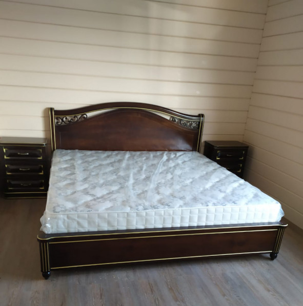 Спальный гарнитур из натурального дерева Грация , массив сосны , цвет красно-коричневый 3 декорирован золотой патиной. Изделие укомплектовано матрасом с ортопедическим эффектом.